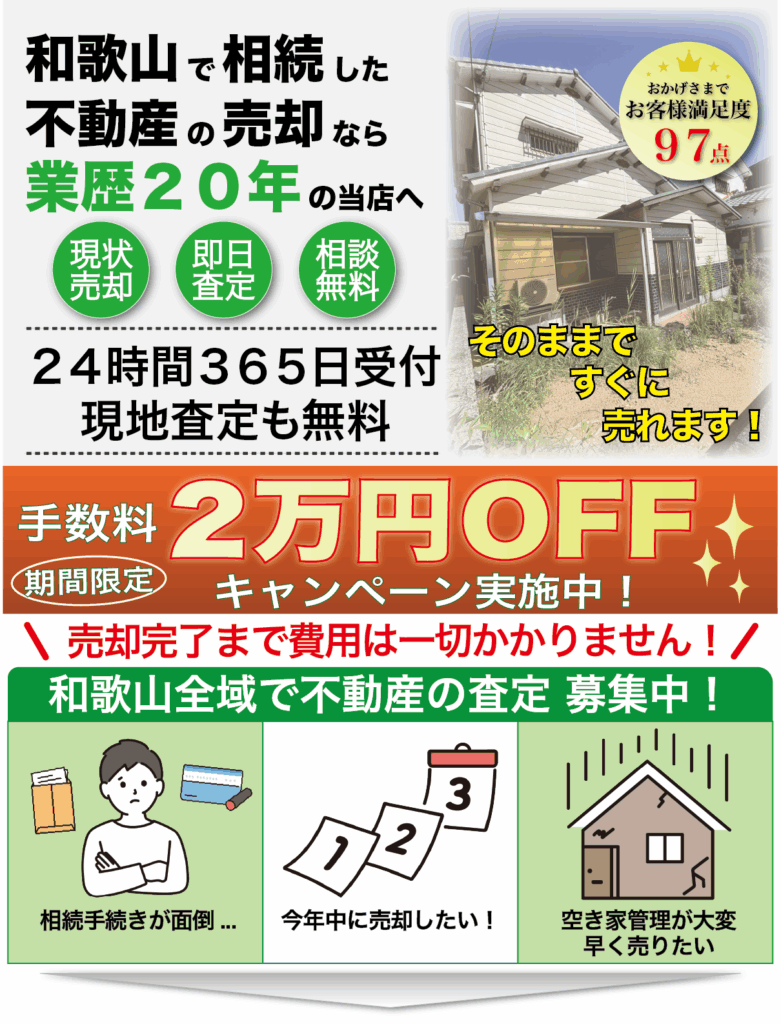 和歌山県内で2000件以上の不動産売却を手がけ、顧客満足度97%を誇る信頼と安心の実績で、どんな物件でも確実に現金化します。